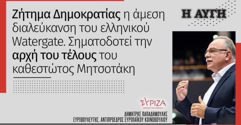 Ως ΣΥΡΙΖΑ-ΠΣ θα κάνει ό,τι περνά από το χέρι του και στην Ελλάδα και στην ΕΕ για να αποδοθούν οι ευθύνες εκεί που πρέπει και η αλήθεια να έρθει στο φως. Η άμεση και πλήρης διαλεύκανση του «ελληνικού Watergate» είναι πρωτίστως ζήτημα δημοκρατίας και σηματοδοτεί την αρχή του τέλους του καθεστώτος Μητσοτάκη.  Η πρόκληση για εμάς είναι τον «τελειωμένο» ως πρωθυπουργό Μητσοτάκη να τον διαδεχθεί μια προοδευτική κυβέρνηση συνεργασίας με κορμό τον  ΣΥΡΙΖΑ-Π.Σ. και όχι ένα νέο κυβερνητικό σύμπραξης σχήμα ΝΔ-ΚΙΝΑΛ μετά τις εκλογές με άλλο πρωθυπουργό, αλλά με τον ίδιο νεοφιλελεύθερο πολιτικό προσανατολισμό, όπως ολοφάνερα επιδιώκει με τις τελευταίες του παρεμβάσεις ο Ευαν. Βενιζέλος.