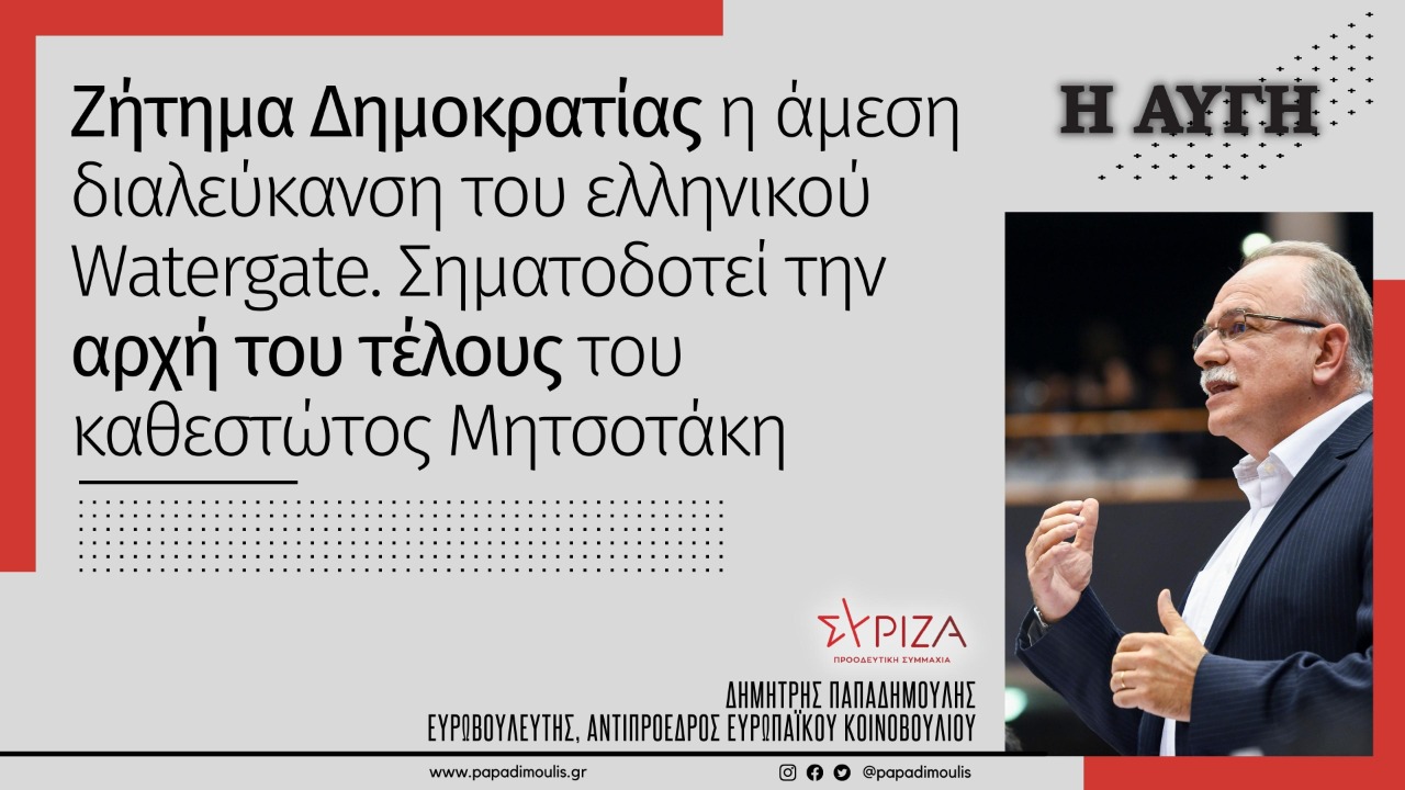 «Το μέγα σκάνδαλο των παρακολουθήσεων, οι αντικρουόμενες κυβερνητικές διαρροές και τα ψεύδη και, εντέλει, η ανεπιτυχής προσπάθεια να διασωθεί ο ίδιος ο Κυρ. Μητσοτάκης, προκαλούν στην κοινωνία μια γενικευμένη αίσθηση απαξίωσης της δημοκρατίας και εργαλειοποίησης των θεσμών», τονίζει σε άρθρο του στην «Αυγή της Κυριακής» ο Αντιπρόεδρος του Ευρωπαϊκού Κοινοβουλίου και επικεφαλής της Ευρωομάδας του ΣΥΡΙΖΑ-Π.Σ. Δημήτρης Παπαδημούλης.