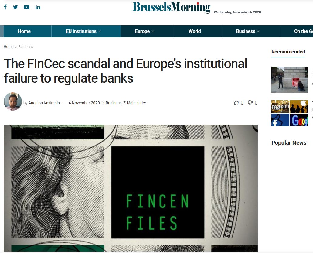 Δηλώσεις για το μέγα οικονομικό σκάνδαλο FinCEN ύψους 2 τρις. dολαρίων, νομιμοποίησης εσόδων από παράνομες δραστηριότητες, που εμπλέκει και τις ευρωπαϊκές τράπεζες, έκανε ο Αντιπρόεδρος του Ευρωπαϊκού Κοινοβουλίου και επικεφαλής της Ευρωομάδας του ΣΥΡΙΖΑ-Προοδευτική Συμμαχία, Δημήτρης Παπαδημούλης, στο ενημερωτικό δίκτυο Brussels Morning (λινκ δημοσίευσης).