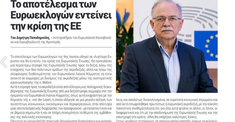 Στο άρθρο με τίτλο «Το αποτέλεσμα των Ευρωεκλογών εντείνει την κρίση της ΕΕ» (Link), ο Δημ. Παπαδημούλης, θίγει θέματα όπως η δεξιόστροφη πολιτική της ΕΕ που δημιουργεί δυσαρέσκεια και ανασφάλεια, η νέα άνοδος της ακροδεξιάς όπως αποτυπώθηκε μετά τις πρόσφατες ευρωεκλογές, αλλά και η επάρκεια της νέας ελληνικής αντιπροσωπείας, που καλείται να εκπροσωπήσει τη χώρα μας στο Ευρωπαϊκό Κοινοβούλιο τα επόμενα πέντε χρόνια.
