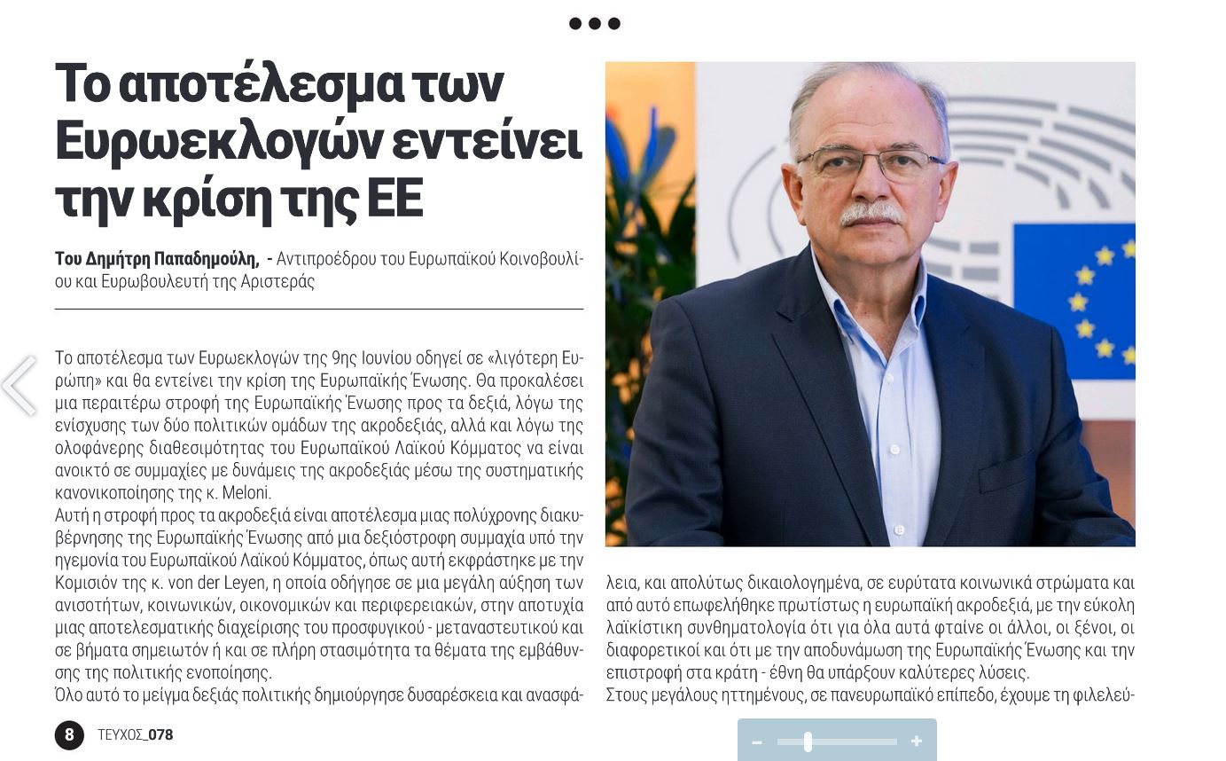 Άρθρο στο περιοδικό του ελληνικού Κοινοβουλίου «Επί του Περιστυλίου» με θέμα το αποτέλεσμα των Ευρωπαϊκών εκλογών, υπογράφει ο Αντιπρόεδρος του Ευρωκοινοβουλίου και ευρωβουλευτής της Αριστεράς, Δημήτρης Παπαδημούλης.