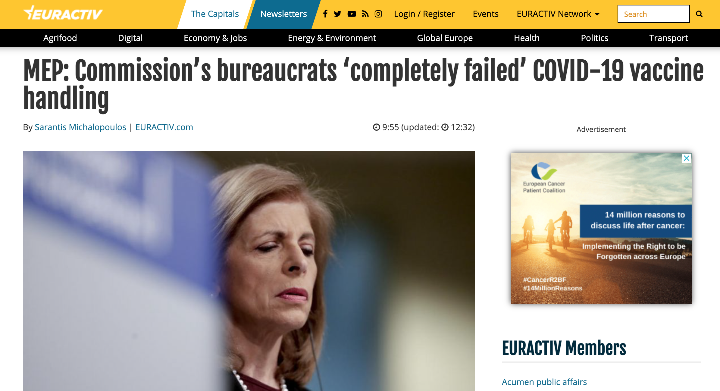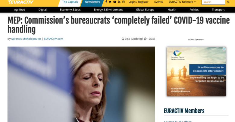 Σε άρθρο του με τίτλο: «Οι γραφειοκράτες της Κομισιόν ‘απέτυχαν εντελώς’ στον χειρισμό των εμβολίων για τον COVID-19» (link) το ευρωπαϊκό ειδησεογραφικό δίκτυο Euractiv, φιλοξενεί δηλώσεις του Αντιπροέδρου του Ευρωπαϊκού Κοινοβουλίου και επικεφαλής της Ευρωομάδας του ΣΥΡΙΖΑ-Προοδευτική Συμμαχία, Δημήτρη Παπαδημούλη, και του κορυφαίου ευρωβουλευτή και πρώην προέδρου της Ευρωομάδας των Σοσιαλιστών, Ούντο Μπούλμαν.