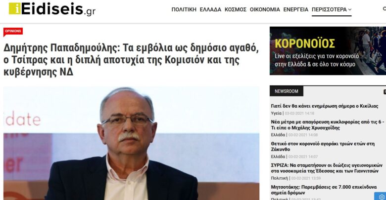 Άρθρο με αφορμή την παταγώδη αποτυχία της ευρωπαϊκής ηγεσίας αναφορικά με την προμήθεια εμβολίων κατά του covid19 και το πρόγραμμα εμβολιασμού του πληθυσμού, υπογράφει ο Αντιπρόεδρος του Ευρωπαϊκού Κοινοβουλίου και επικεφαλής της Ευρωομάδας του ΣΥΡΙΖΑ – Προοδευτική Συμμαχία, Δημήτρης Παπαδημούλης, στο ενημερωτικό website iEidiseis.GR.