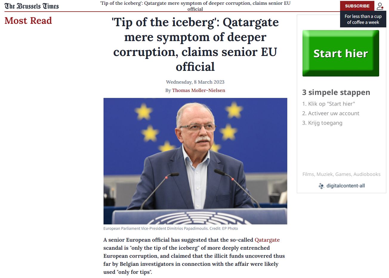 Στο άρθρο με τίτλο “Η κορυφή του παγόβουνου“ <-LINK) ο Δημ. Παπαδημούλης χαρακτηρίζει το Qatargate ως «απλό σύμπτωμα της βαθύτερης διαφθοράς στην ΕΕ», ενώ δηλώνει επίσης ότι είχε «βαθιές ηθικές επιφυλάξεις» για την Ελληνίδα ευρωβουλεύτρια Εύα Καϊλή (S&D), πριν από την εκλογή της στην Αντιπροεδρία του Ευρωπαϊκού Κοινοβουλίου.