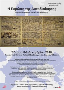 Διημερίδα με θέμα «Η Ευρώπη της Αυτοδιοίκησης» διοργανώνουν η Οργάνωση Μελών του ΣΥΡΙΖΑ Έδεσσας και το Δίκτυο Αυτοδιοίκησης Ευρωπαϊκής Αριστεράς το Σαββατοκύριακο 8 και 9 Δεκεμβρίου στο Πολιτιστικό Κέντρο Δήμου Έδεσσας (Παλαιό Παρθεναγωγείο, Βαρόσι).