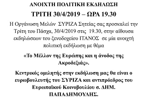 Κεντρικός ομιλητής σε εκδήλωση της Οργάνωσης Μελών ΣΥΡΙΖΑ Σητείας, στο νομό Λασιθίου στην Κρήτη, θα είναι ο Αντιπρόεδρος του Ευρωπαϊκού Κοινοβουλίου και υποψήφιος ευρωβουλευτής του ΣΥΡΙΖΑ, Δημήτρης Παπαδημούλης.