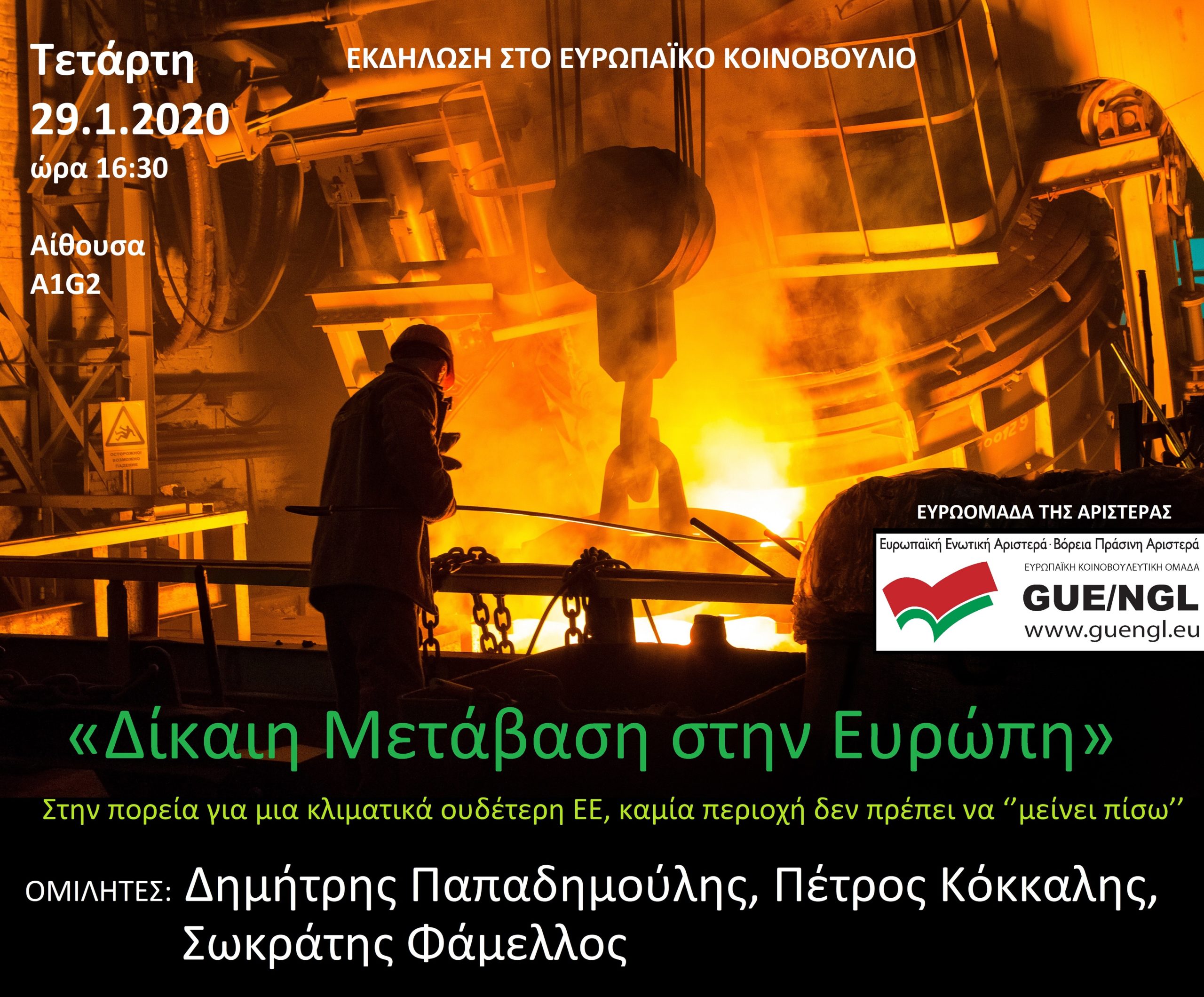Η Ευρωομάδα της Αριστεράς (GUE/NGL) διοργανώνει εκδήλωση με θέμα τη «Δίκαιη Μετάβαση στην Ευρώπη». Η εκδήλωση θα πραγματοποιηθεί την Τετάρτη 29 Ιανουαρίου στις 16:30-19:00, στο Ευρωπαϊκό Κοινοβούλιο (Αίθουσα ASP 1G2).