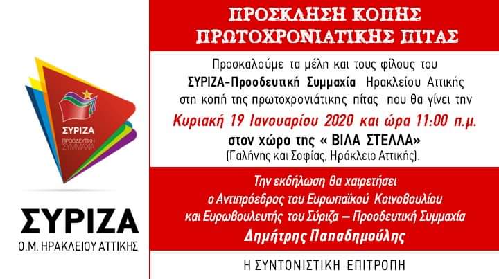 Εκδήλωση για την κοπή της πρωτοχρονιάτικης πίτας της πραγματοποιεί την Κυριακή, 19/1, στις 11.00, στη “Βίλα Στέλλα” (Γαλήνης και Σοφίας) η Οργάνωση Μελών ΣΥΡΙΖΑ Ηρακλείου Αττικής.