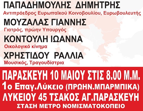 Θα μιλήσει σε εκδήλωση του ΣΥΡΙΖΑ στις 20.00, στο 1ο Επαγγελματικό Λύκειο - Συνομιλητές οι υποψήφιοι ευρωβουλευτές ΣΥΡΙΖΑ Γ. Μουζάλας, Ι. Κοντούλη, Ρ. Χρηστίδου