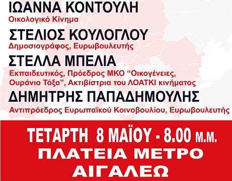 Η εκδήλωση θα πραγματοποιηθεί στις 20.00 στην κεντρική πλατεία του Αιγάλεω, με τίτλο «Για την Ελλάδα των πολλών, για την Ευρώπη των λαών».