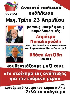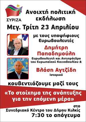 Το Κιλκίς επισκέπτεται στις 23 Απριλίου ο Αντιπρόεδρος του Ευρωπαϊκού Κοινοβουλίου και υποψήφιος ευρωβουλευτής του ΣΥΡΙΖΑ, Δημήτρης Παπαδημούλης, ύστερα από πρόσκληση της Νομαρχιακής Επιτροπής του ΣΥΡΙΖΑ.