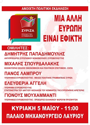 Κεντρικός ομιλητής σε εκδήλωση του ΣΥΡΙΖΑ στο Λαύριο, την Κυριακή 5 Μαΐου, θα είναι ο Αντιπρόεδρος του Ευρωπαϊκού Κοινοβουλίου και υποψήφιος ευρωβουλευτής του ΣΥΡΙΖΑ, Δημήτρης Παπαδημούλης, ύστερα από πρόσκληση των Οργανώσεων Μελών του ΣΥΡΙΖΑ σε Λαύριο και Σαρωνικό.