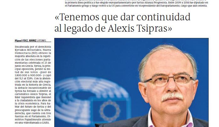 Στη συνομιλία του με τον ισπανό δημοσιογράφο, που δημοσιεύεται με τίτλο “Πρέπει να συνεχίσουμε την κληρονομιά του Αλέξη Τσίπρα” <-LINK, ο Δημήτρης Παπαδημούλης αναφέρεται στις μετεκλογικές εσωκομματικές εξελίξεις στον ΣΥΡΙΖΑ-ΠΣ, στον αντιπολιτευτικό ορίζοντα, όπως αυτός διαμορφώνεται μετά τις εθνικές εκλογές της 25ης Ιουνίου, αλλά και στην άνοδο της ακροδεξιάς στην Ευρώπη, η οποία εκφράζεται πλέον και στην Ελληνική Βουλή, τόσο εκτός όσο και εντός του κόμματος της ΝΔ.